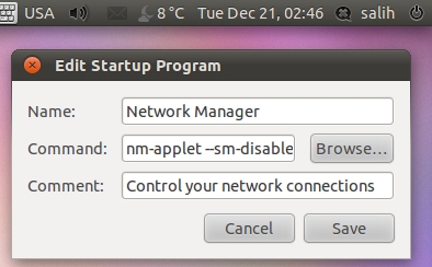 Όπως βλέπεται στην εικόνα είναι έχω επιλέξει το στοιχείο διαχείρισης δικτύου και η εντολή που τρέχει είναι η nm-applet. Με ενδιαφέρει να ξεκινήσει πιο μετά, ας πούμε 15 δευτερόλεπτα αφού έχει φορτώσει η επιφάνεια εργασίας. Για να το κάνετε αυτό πρέπει να προσθέσετε πριν απο την εντολή μια χρονική καθυστέρηση.