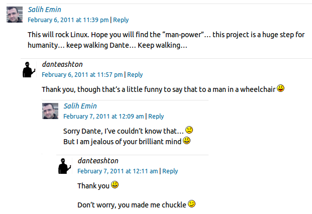 Dante Ashton: Λοιπόν… ονομάζομαι Dante. Πάσχω απο εγκεφαλική παράλυση, σύνδρομο Asperger και επιληψία με αποτέλεσμα να είμαι σε αναπηρικό αμαξίδιο. Η ομάδα μας είναι αρκετά καινούρια. Ο στενός μου φίλος Jacky Alcine, έχει προσφερθεί εθελοντικά να αναλάβει και να μετατρέψει σε κώδικα τις ιδέες μου. Έχουμε προσελκύσει έναν αριθμό ανθρώπων σε όλο τον κόσμο, από μαθητές έως και ανθρώπους με διδακτορικό και καθηγητές πανεπιστημίου. Αυξανόμαστε με «ανησυχητικά» ραγδαίο ρυθμό :-)