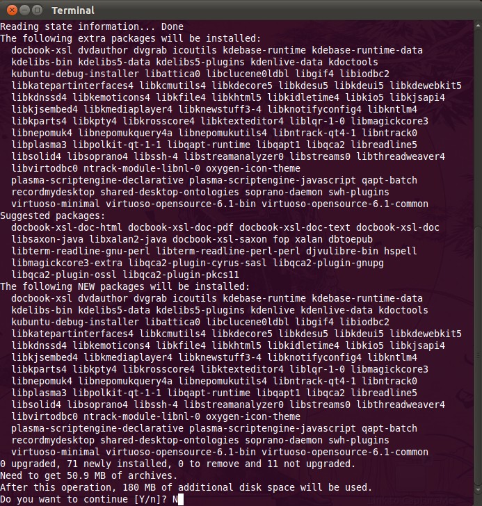 Την τεχνική θα την μάθουμε με παραδείγματα. Ας δοκιμάσουμε τώρα να εγκαταστήσουμε το Kdenlive, μια σουίτα επεξεργασίας Βίντεο το οποίο είναι γραμμένο σε Qt με αποτέλεσμα να έχει πάρα πολλές εξαρτήσεις του KDE. O γενικός κανόνας τις εντολής σε όλες τις Ubuntu/Debian διανομές ειναι:
