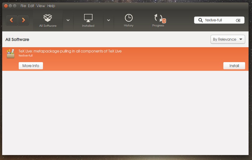 Για να τα εγκαταστήσουμε, ανοίγουμε το Κέντρο λογισμικού και κάνουμε αναζήτηση για texlive. Κάνουμε κλικ κάτω αριστερά «Εμφάνιση τεχνικών πακέτων» και έπειτα εντοπίζουμε το πακέτο «texlive-full» και πατάμε «Εγκατάσταση». Η εγκατάστασή του θα πάρει αρκετή ώρα διότι είναι περίπου 3.5 GB. Αφού ολοκληρωθεί, κάνουμε αναζήτηση για texmaker το οποίο με την σειρά του είναι 450MB και πατάμε εγκατάσταση.