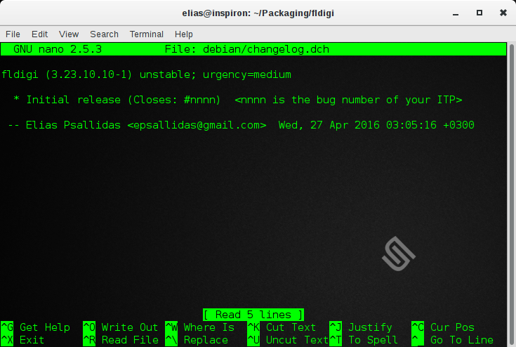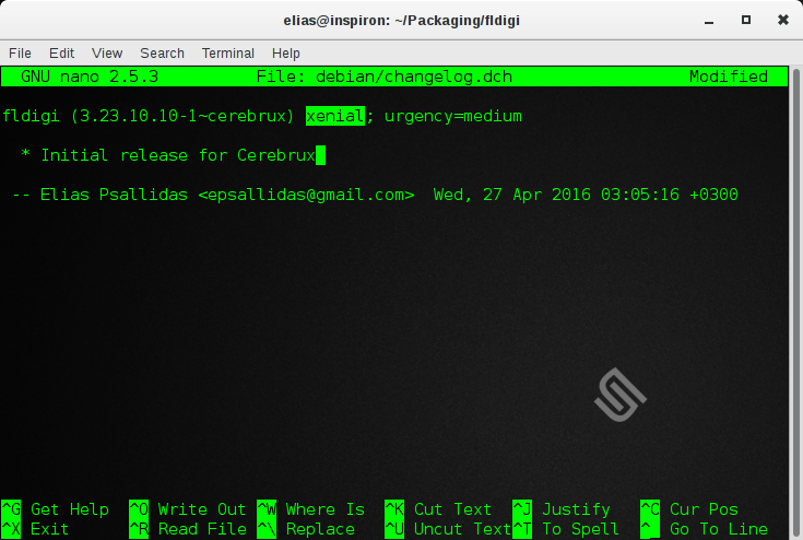 Εδώ, παρατηρήστε πως υπάρχει η γραμμή «$distribution = «xenial»;». Σε αυτό το σημείο, δηλώνουμε για ποια έκδοση του Ubuntu θα δημιουργήσουμε πακέτα. Στην προκειμένη περίπτωση, το xenial αντιστοιχεί στην έκδοση Ubuntu 16.04 LTS. Ακόμα, στην τελευταία γραμμή βλέπουμε αναφορά στον φάκελο «ubuntu/logs», που δημιουργήθηκε σε προηγούμενο βήμα. Αν έχετε φτιάξει φάκελο με άλλο όνομα και σε άλλη θέση, κάντε τις ανάλογες αλλαγές στην τελευταία γραμμή (το $ENV{HOME}. αντιστοιχεί στον προσωπικό φάκελο, οπότε κάντε τις αλλαγές μετά από αυτό).Ακόμα, προσέξτε τη γραμμή όπου θα πρέπει να προσθέσετε το ονοματεπώνυμό σας και το e-mail σας, ως maintainer του πακέτου.