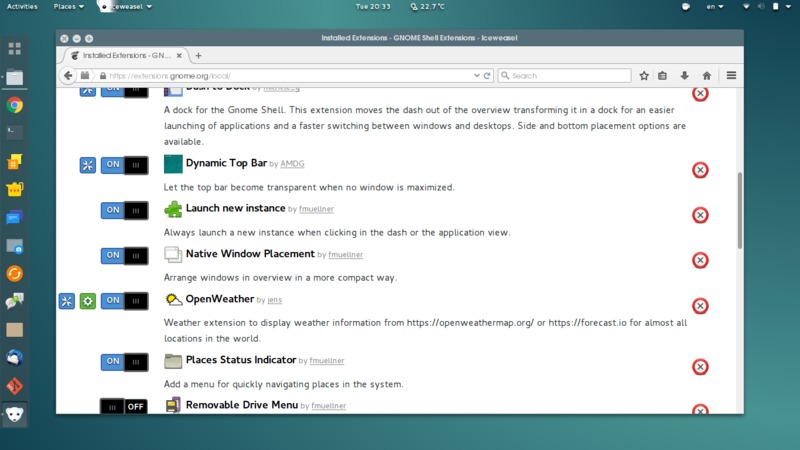 Παρόλα αυτά το δυνατό σημείο του Gnome Shell είναι τα «πρόσθετα» (extensions) και τα «θέματα» (themes) που διαθέτει και μάλιστα η ευκολία με την οποία αυτά γίνονται εγκατάσταση και αλλάζουν. Συγκεκριμένα, τα extensions μπορείτε να τα κάνετε εγκατάσταση αλλά και αναβάθμιση απευθείας από τον Firefox όπως φαίνεται στην παρακάτω εικόνα (όπου φαίνεται ότι υπάρχει μια ενημέρωση για το openweather extension)