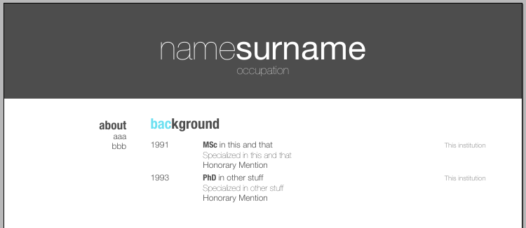 Το τελευταίο και σημαντικότερο κατά τη γνώμη μου, είναι ότι δεν τα πάει καθόλου καλά με την ελληνική γλώσσα. Κοινώς αν θες να κάνεις βιογραφικό στα ελληνικά πρέπει να κάνεις edit το αρχείο .cls και να αλλάξεις τις γραμματοσειρές ή κάνοντας comment όλες τις σειρές με τα δικά του και να κάνεις uncomment αυτές με το helvetica Neue και να τις αλλάξεις με κάποιες από τις default της LaTeX που τα πάνε καλά με τα Ελληνικά, κατά προτίμηση κάποια από τις GFS γραμματοσειρές που παίζουν μια χαρά και είναι default στη LaTeX.
