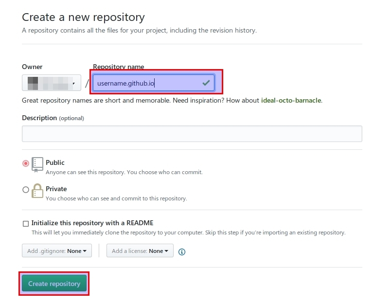 Απαραιτήτως πρέπει να δώσουμε την ονομασία του αποθετηρίου μας με την παρακάτω μορφή (όπου username αυτό με το οποίο έχετε εγγραφεί στο github) αλλιώς δε θα δουλέψει η ιστοσελίδα μας