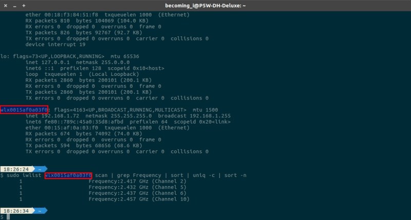 Εγώ χρησιμοποιώ το κανάλι 6 στο δίκτυο μου. Το αποτέλεσμα μου είναι πολύ συγκεκριμένο γιατί έκανα χρήση της εντολής grep και των pipelines προκειμένου να φιλτράρω τα αποτελέσματα όπως μάθαμε στις καλές συνήθειες του τερματικού. Συγκεκριμένα με το uniq -c μετρήσαμε τα δίκτυα που χρησιμοποιούν τα ίδια κανάλια και αφού τα βάλαμε στη σειρά, με την sort -n τα βάλαμε στη σειρά βάσει του συνολικού αριθμού δικτύων για κάθε συγκεκριμένο κανάλι. Στην περίπτωση μου μόνο εγώ στη γειτονιά μου χρησιμοποιώ το κανάλι 6.
