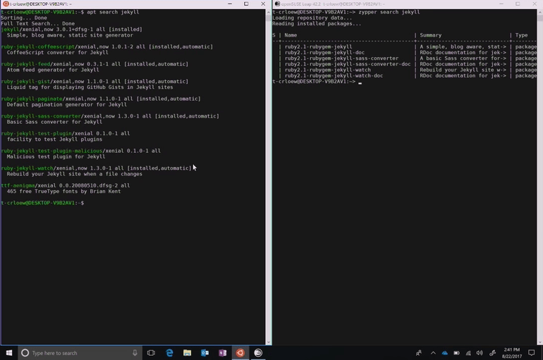 Ο Loewen παρουσίασε τη δυνατότητα να τρέχουν παράλληλα πολλές διανομές Linux, δείχνοντας παραθυρικές εκδόσεις του Ubuntu και του openSuse Leap 42 να ψάχνουν μέσω των διαχειριστών πακέτων τους, τον website generator jekyll.