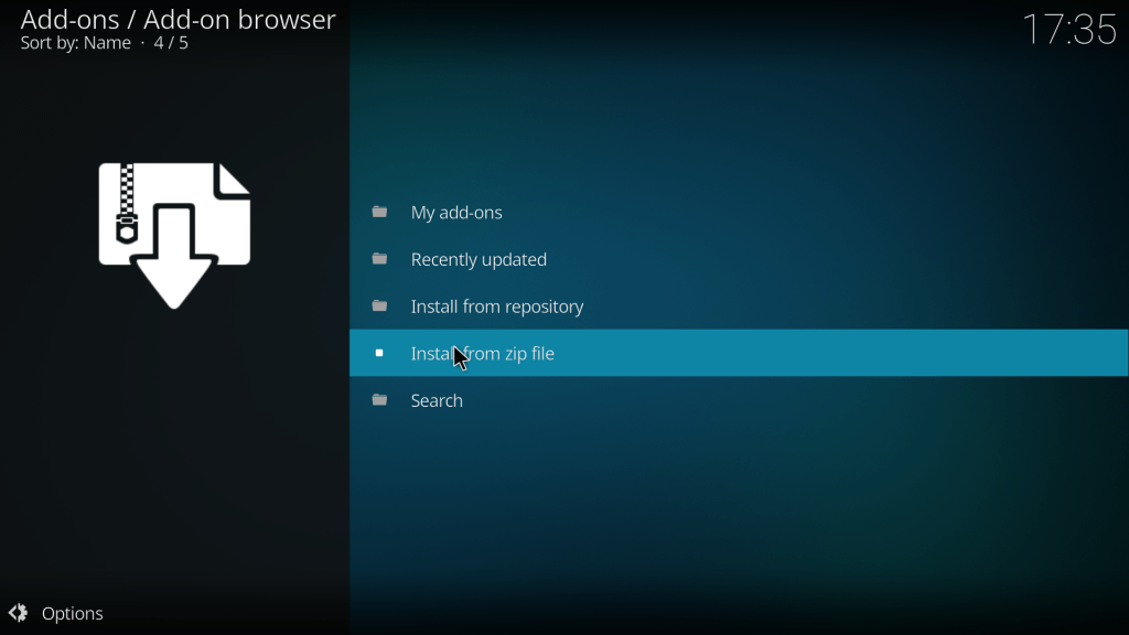 Κατεβάζουμε από την τοποθεσία του Ζοmboided το απαιτούμενο plugin και το μεταφέρουμε στην συσκευή που έχουμε εγκατεστημένο το Kodi (π.χ. με USB). Στη συνέχεια ανοίγουμε το Kodi και πηγαίνουμε Add-ons