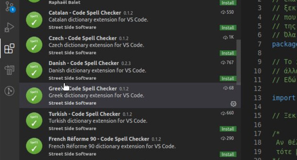 Οι ίδιοι developer, έχουν αναπτύξει επέκταση για ελληνικά αλλά και υποστήριξη για άλλες γλώσσες οπότε μπορείτε να προσθέσετε όποια γλώσσα σας ενδιαφέρει. Οπότε πηγαίνοντας παρακάτω, θα βρείτε το Greek – Code Spell Checker και κάντε το εγκατάσταση
