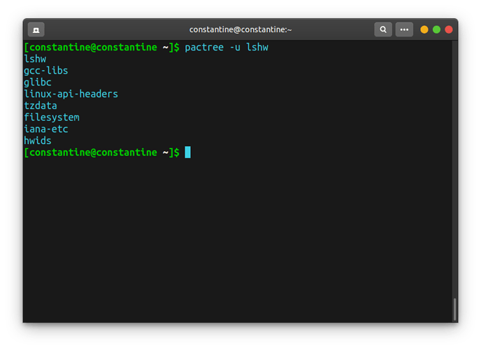 Εδώ βλέπουμε σε δεντροειδή μορφή (εξού και pactree από το package tree) τις εξαρτήσεις του lshw πακέτου