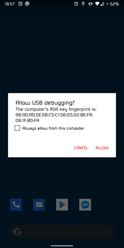 Συνδέουμε μέσω καλωδίου το κινητό με τον υπολογιστή. Και εφόσον έχουμε ενεργοποιήσει το Usb Debugging (που κάναμε πιο πάνω), ξεκλειδώνουμε την οθόνη του κινητού και αποδεχόμαστε «allow» την σύνδεση με τον υπολογιστή.
