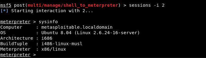 Για να αλληλεπιδράσετε με το meterpreter shell, πληκτρολογήστε sessions -i ακολουθούμενη από τον αριθμό του meterpreter session που είναι το 2 στην περίπτωσή μας.