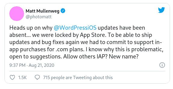 Ο ιδρυτής του WordPress, Matt Mullenweg κατηγορεί την Apple ότι έκοψε τη δυνατότητα αναβάθμισης της εφαρμογής μέχρι να προσθέσει αγορές εντός της εφαρμογής, ώστε η «πιο πολύτιμη εταιρεία» στον κόσμο να τσιμπάει το 30% των κερδών από την πώληση αυτών των υπηρεσιών.