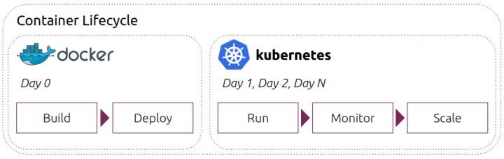 Το Docker χρησιμοποιείται ως επί το πλείστον κατά τις πρώτες ημέρες μιας εφαρμογής σε container. Βοηθά στην κατασκευή και ανάπτυξη των container της εφαρμογής. Σε περιπτώσεις όπου η αρχιτεκτονική της εφαρμογής είναι αρκετά απλή, το Docker μπορεί να καλύψει τις βασικές ανάγκες της διαχείρισης του κύκλου ζωής της εφαρμογής. Σε περιπτώσεις όπου η εφαρμογή χωρίζεται σε πολλαπλές μικροϋπηρεσίες, καθεμία με τον δικό του κύκλο ζωής και τις λειτουργικές ανάγκες της, το Kubernetes μπαίνει στο παιχνίδι.