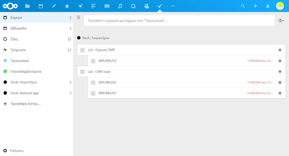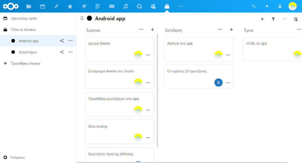 Τέλος έχουμε και το Deck το οποίο είναι μία υπηρεσία που δεν υπάρχει κάποιο αντίστοιχο στη Google. Πρόκειται για μία εφαρμογή οργάνωσης εργασιών σε στυλ πίνακα «Kanban», στον οποίο μπορούμε να οργανώσουμε την πρόοδο ενός project. Είναι τρομερά λειτουργικό και μας επιτρέπει να συνεργαστούμε και με άλλους χρήστες, ορίζοντας τις αρμοδιότητες του καθενός ξεχωριστά.