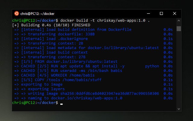 Σημείωση: Το νέο μου image θα έχει ονομασία «web-apps», έκδοση «1.0» και εκδότη τον «chriskay». Η τελεία (.) στο τέλος της εντολής δεν είναι καθόλου τυχαία και σημαίνει ότι τα αρχεία που αναφέρονται στο Dockerfile βρίσκονται στον ίδιο φάκελο απο όπου τρέχω την εντολή.