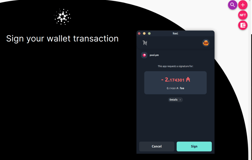 - Βήμα 4: Θα ανοίξει το Nami wallet μας και θα μας ρωτήσει αν του δίνουμε δικαίωμα πρόσβασης στο ιστορικό συναλλαγών το οποίο και παραχωρούμε. Στην συνέχεια θα μας ζητήσει να «υπογράψουμε» (αποδεχτούμε) την συναλλαγή και το κόστος συμμετοχής (επειδή θα είναι η πρώτη φορά θα χρεωθούμε 2 ADA + 0.17 ADA) οπότε πατάμε Sign
