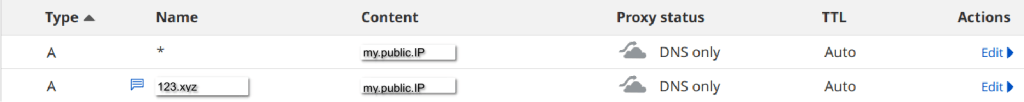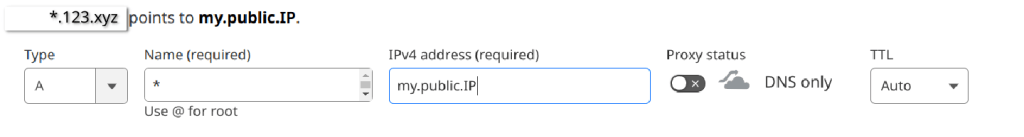 Είναι όμως πιο γρήγορο και βολικό να κάνουμε ένα ‘A’ της μορφής ‘*.123.xyz’ (χωρίς να είναι proxied) και όχι το ‘123.xyz’, ώστε όταν επιλέγουμε subdomains για τις εφαρμογές μας μέσα από τον Server μας, αυτό να καταχωρείται αυτόματα χωρίς να απαιτείται να επισκεπτόμαστε διαρκώς την Cloudflare για προσθήκες και τροποποιήσεις. Αυτή «τεχνική» ονομάζεται wildcard ή catchall domain που είχαμε δει στα μαθήματα docker.