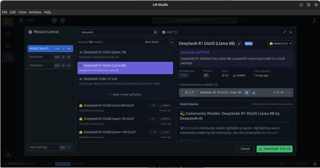 Αφού το ανοίξετε, κάντε κλικ στο κουμπί αναζήτησης «Deepseek» και επιλέξτε το μοντέλο που είναι συμβατό με το hardware σας (θα επιλεχτεί αυτόματα) και με το μέγεθος που θέλετε να κατεβάσετε το.