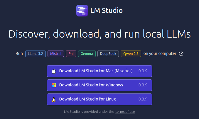 Το LM Studio είναι ένα άλλο εργαλείο για χρήση τοπικής αλληλεπίδρασης με LLMs. Παρέχει ένα ευρύτερο φάσμα λειτουργιών, όπως η αναζήτηση, η λήψη και η εκτέλεση τοπικών LLM, με ενσωματωμένες διεπαφές συνομιλίας (chat) και συμβατότητα με τοπικούς διακομιστές LLM. Γενικά θεωρείται πιο φιλικό περιβάλλον από το Ollama και προσφέρει επίσης μεγαλύτερη ποικιλία επιλογών μοντέλων.