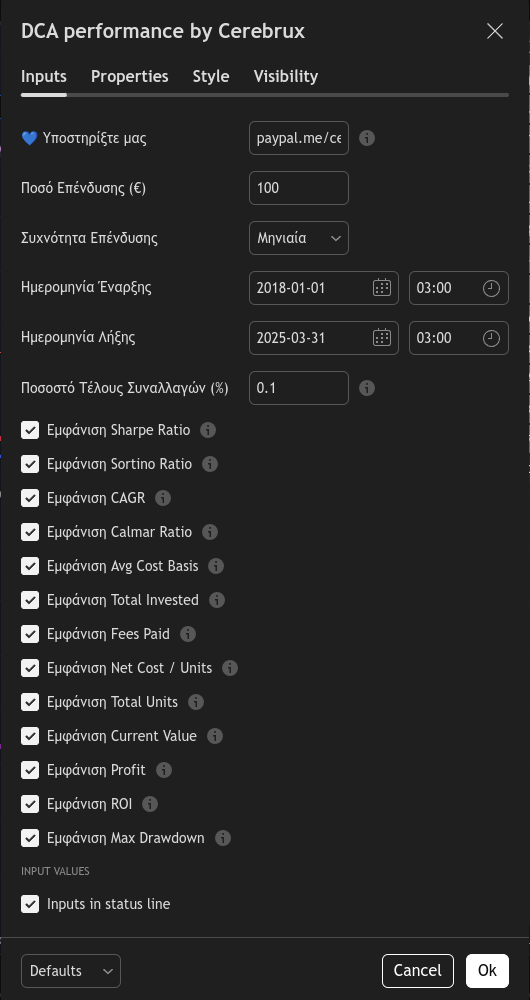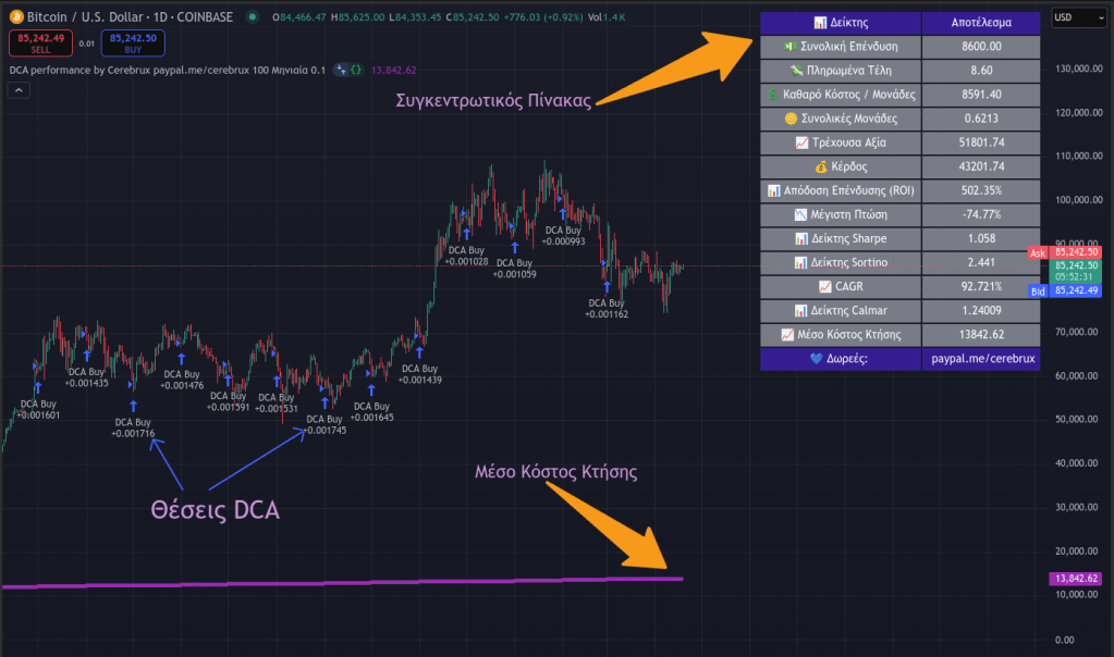 Σε αυτό το άρθρο, παρουσιάζουμε τον κώδικα που χρησιμοποιήσαμε για να εξετάσουμε την απόδοση της στρατηγικής DCA για πέντε δημοφιλή κρυπτονομίσματα (BTC, ETH, LTC, XRP, ADA) από τον Ιανουάριο του 2018 έως και τον Μάρτιο του 2025, επενδύοντας 100 ευρώ κάθε μήνα. Στην συνέχεια θα παρουσιάσουμε τον indicator που κατασκευάσαμε για χρήση στο TradingView.