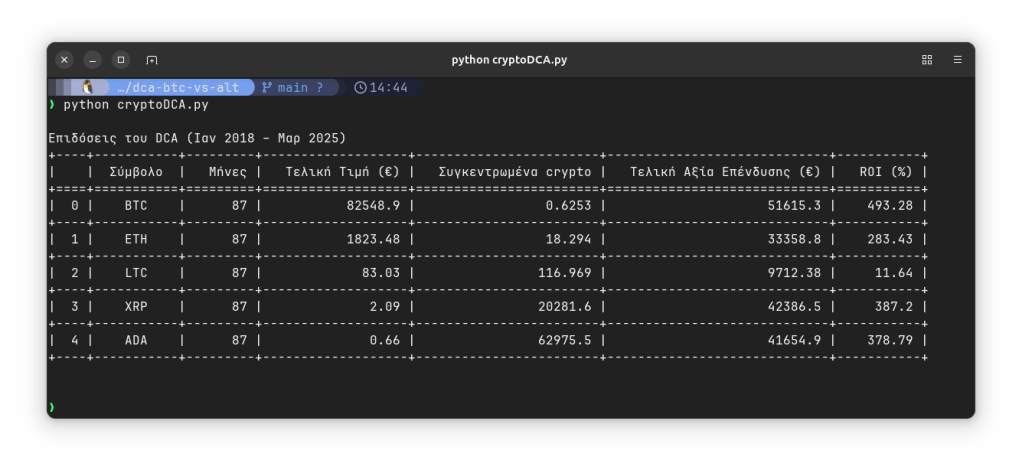 - Συγκεντρώνει τη συνολική ποσότητα crypto και υπολογίζει την τελική αξία της επένδυσης με βάση την τιμή του Μαρτίου 2025.