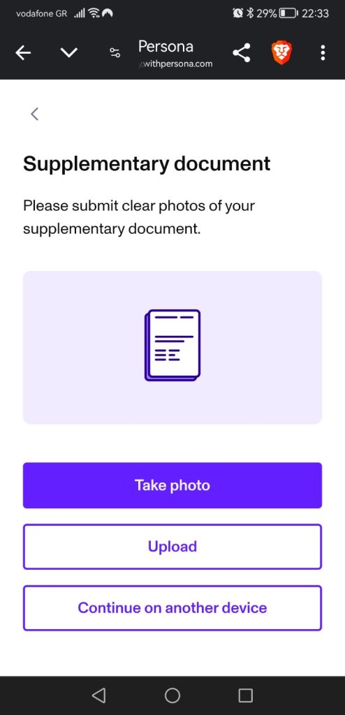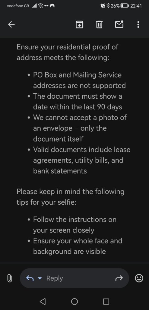 Όταν έρθει το email, εδώ θα χρειαστεί να ανεβάσεις, όπως λέει το email κάποιο λογαριασμό ρεύματος, νερού ή κάποιο επίσημο έγγραφο κλπ (που να έχει το ονοματεπώνυμο και την διεύθυνση που δήλωσες), τέλος θα σου ζητηθεί να τραβήξεις Selfie (γίνεται μέσα από την σελίδα).