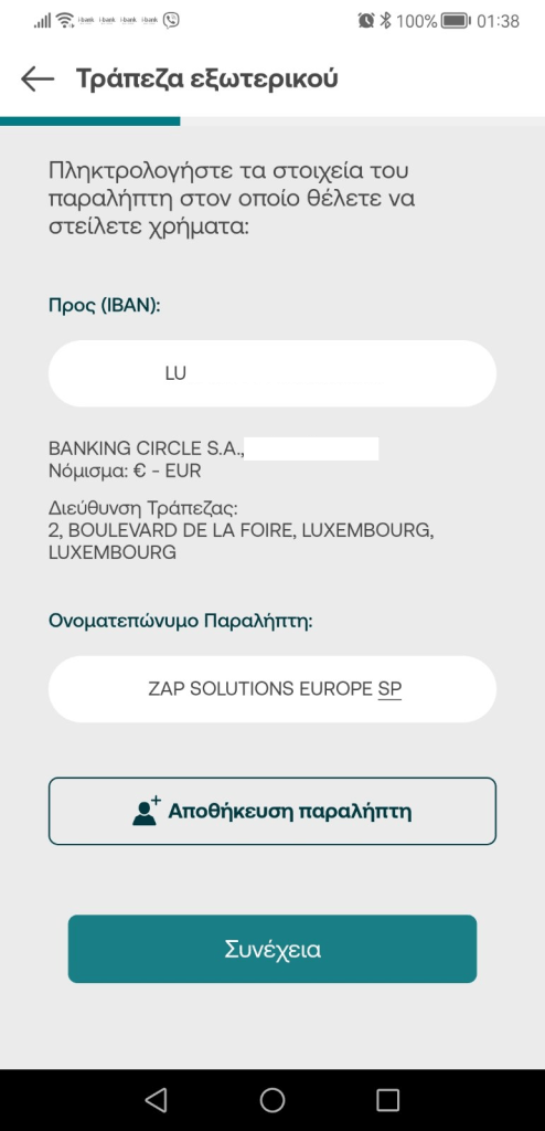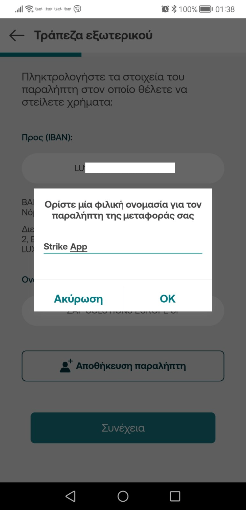 Συμπληρώνεις και το όνομα δικαιούχου που είναι η εταιρεία της Strike «ZAP SOLUTIONS» και αν θες σε αυτή την φάση πατας αποθήκευση παραλήπτη για να κρατήσεις τα στοιχεία.