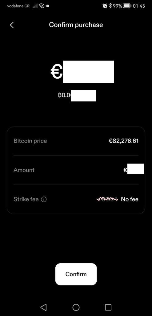 Πας στη καρτέλα του ₿ Bitcoin και επιλέγεις Buy. Αποφασίζεις το ποσό που θα δαπανήσεις σε € (από αυτά που έχεις στο Strike σου) και το αντίκρισμα του θα το λάβεις σε ₿ Bitcoin !