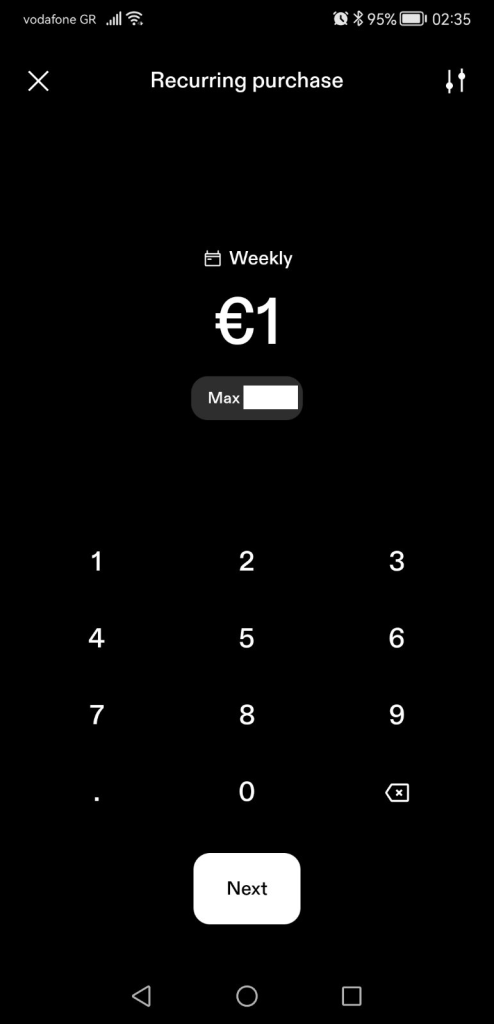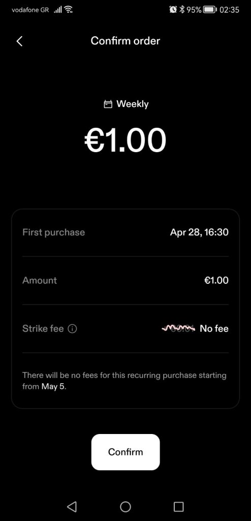 Αυτόματες Επαναλαμβανόμενες Αγορές (DCA) Μπορείς να ορίσεις ένα συγκεκριμένο ποσό (π.χ. 5€) και συχνότητα (π.χ. κάθε εβδομάδα), και το Strike θα αγοράζει Bitcoin για σένα αυτόματα, χωρίς να χρειάζεται να κάνεις κάτι.