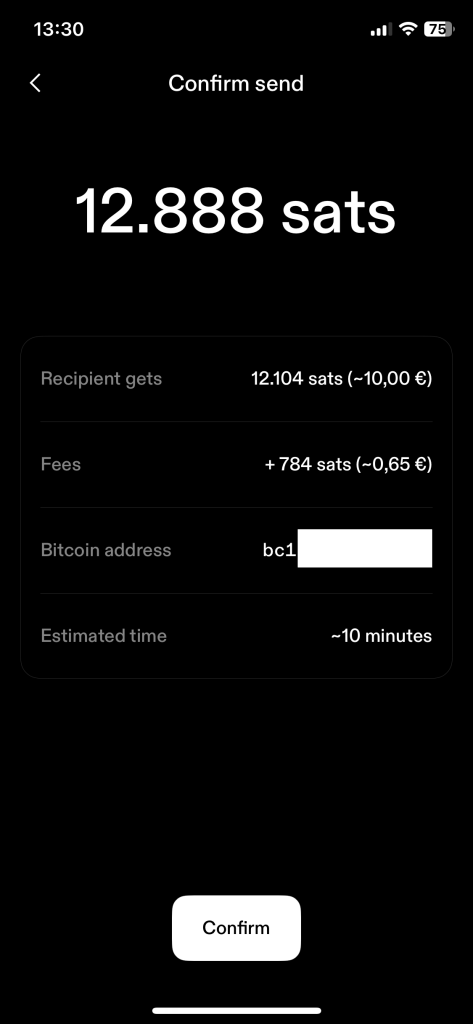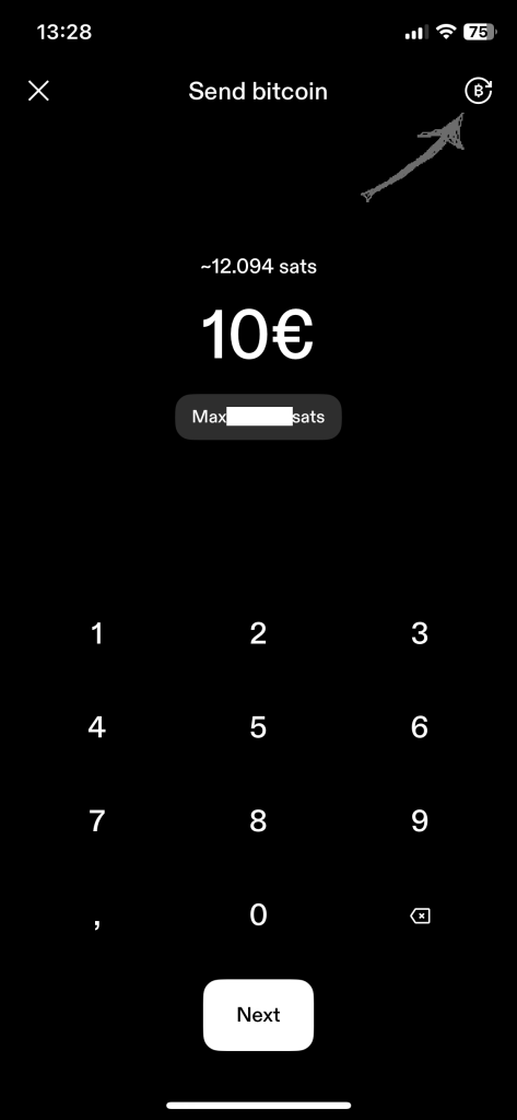 Μετά από το scan θα μας δώσει την δυνατότητα να αποφασίσουμε «πόσα» sats θέλουμε να στείλουμε. Εδώ μπορείτε να επιλέξετε από δεξιά επάνω το πως θέλετε να υπολογίζετε/γράψετε το ποσό (σε € ή σε Sats). Εμείς για το πείραμα μας, μας βόλεψε να πούμε «10€» αντί να μαντέψουμε ότι είναι 12 χιλιάδες Sats.