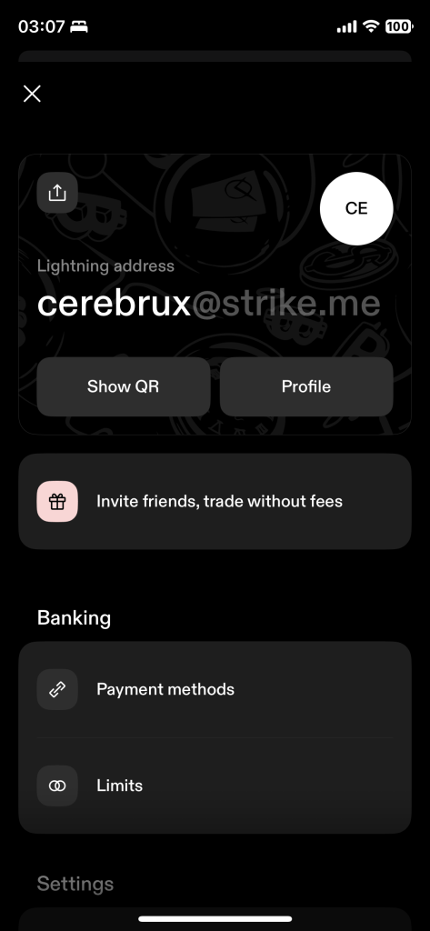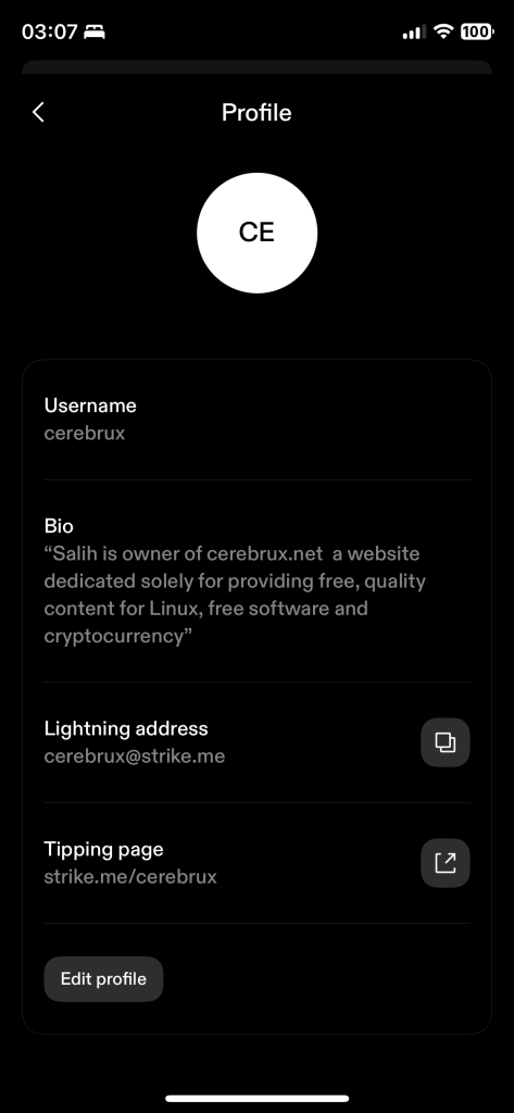 Αν πάτε στο προφίλ του λογαριασμού σας, θα προσέξετε ότι σας δίνει και μια διεύθυνση @strike .me . Αυτή είναι η διεύθυνση του lightning based λογαριασμού σας στο Strike.