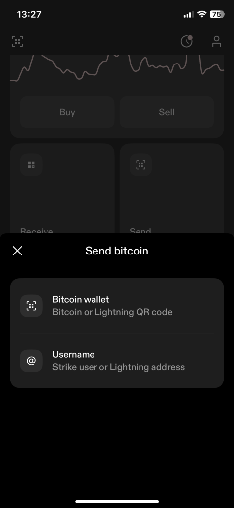 Ανοίγουμε το Strike App μας και επιλέγουμε Send και στην συνέχεια την επιλογή Bitcoin Wallet για να σκανάρουμε το QR που μας έδωσε το Trezor.