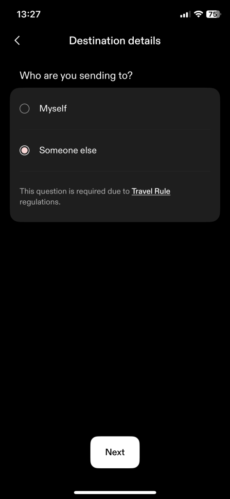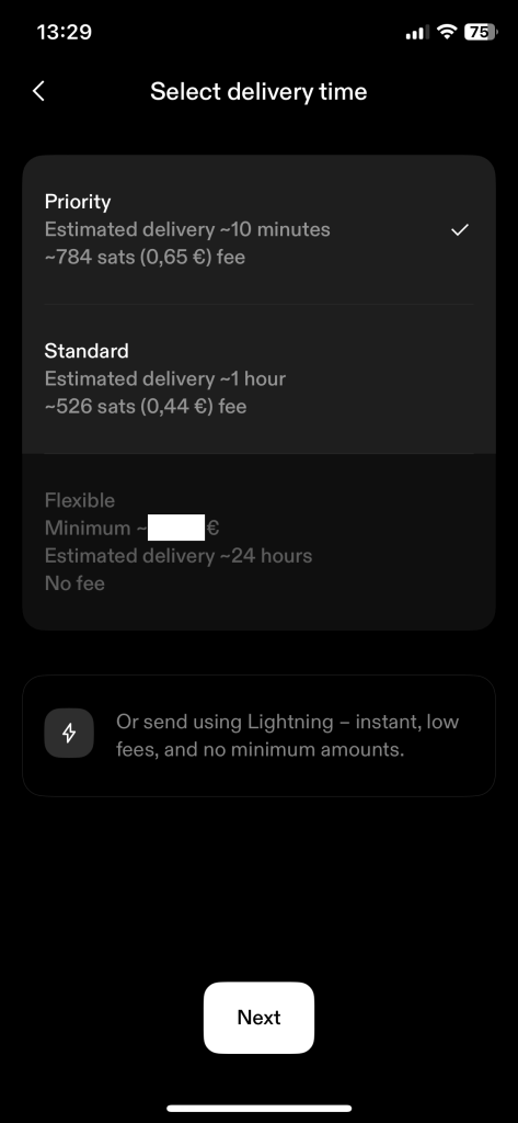 Αφού επιλέξουμε ότι το στέλνουμε σε άλλον, μας ρωτάει να αποφασίσουμε «πόσο γρήγορα» θέλουμε να φτάσει το ποσό στο Trezor μας. Αυτό ουσιαστικά καθορίζεται, όπως είπα πιο πάνω από πολλούς παράγοντες όπως π.χ. η συμφόρηση του Bitcoin blockchain. Αν θέλουμε να στείλουμε με 0 κόστος και δεν μας πειράζει να περιμένουμε 24 ώρες, τότε θα πρέπει να στείλουμε μεγαλύτερο ποσό (καθορίζεται από το υπόλοιπό σου στο Stike)