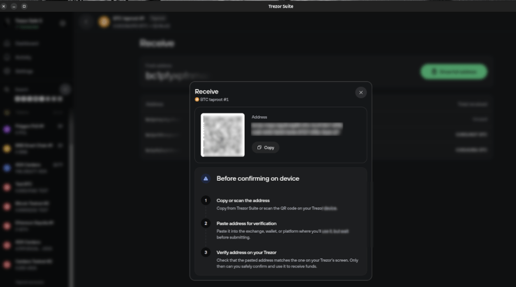 Χρειαζόμαστε την διεύθυνση που θα μας δώσει το Trezor. Οπότε επιλέγουμε το BTC και πατάμε Receive στο Trezor μας και ακολουθούμε τις οδηγίες για να μας εμφανίσει μια διεύθυνση παραλαβής με QR code.